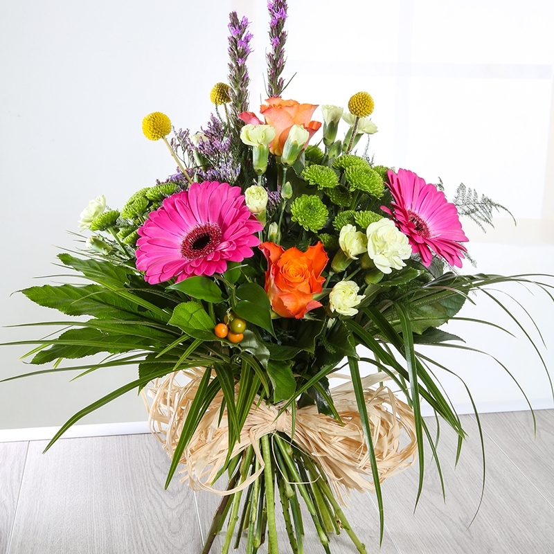 Our vibrant hand-tied Valentina is a striking bouquet, making it a perfect gift for any occasion. Full of fresh. colourful flowers including Gerbera, Roses and Carnations