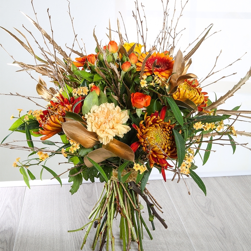 Our enchanting Skyler bouquet is full of rich shades of orange, reds and golds. Made with a range of fresh flowers including Euphorbia, Chrysanthemum, Germini, Roses complimented with foliage and gold twigs.