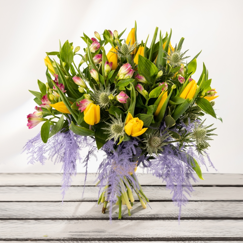 A beautifully colourful hand-tied with a modern twist, we simply adore the Holkam Bouquet! We use a stunning combination of seasonal flowers such as yellow tulips, pink alstroemeria, blue thistle with purple feathery foliage.