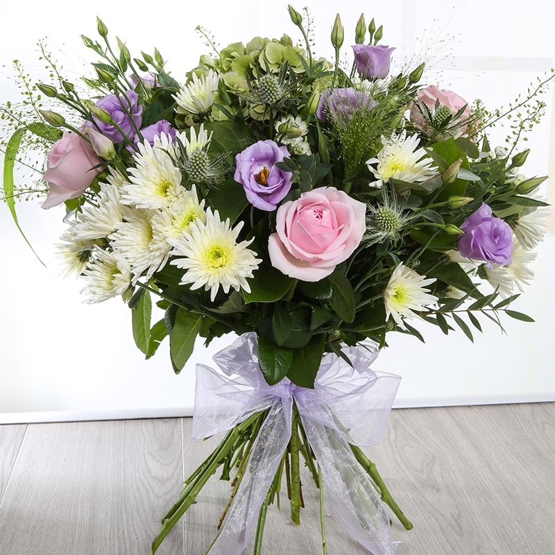 Pretty pastels and fresh foliage make Issey one of our favourite bouquets. Using classic colours of soft purple, pink and creams from a mix of fresh flowers including Hydrangea, Roses and Thiaspi Bell.